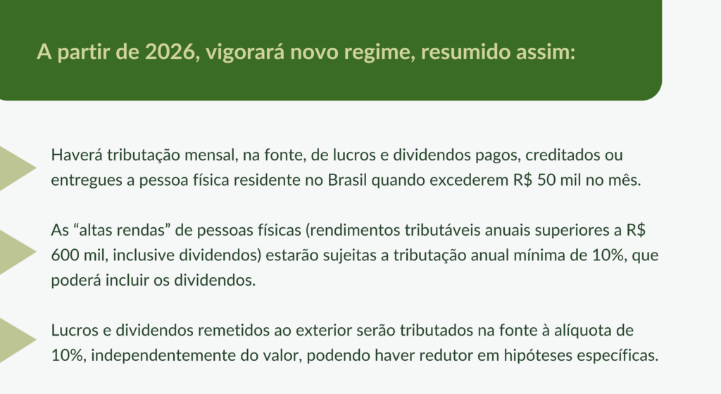 O legislador instituiu ainda regra de transição para lucros relativos a resultados apurados até 2025. As pessoas jurídicas poderão deliberar, até o fim de 2025, pela distribuição desses lucros e realizar o seu pagamento até 2028. Assim, observados requisitos legais (como ato societário específico), os lucros anteriores a 2026 poderão ser distribuídos ao sócio pessoa física de forma isenta até 2028, sem retenção mensal na fonte nem incidência da tributação anual das “altas rendas”.