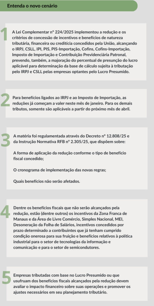 A Lei Complementar nº 224/2025 instituiu a redução dos incentivos e benefícios fiscais de natureza tributária concedidos pela União e estabelece a majoração do percentual de presunção do lucro aplicável para determinação da base de cálculo sujeita à tributação do IRPJ e da CSLL por empresas optantes pelo Lucro Presumido, com efeitos a partir de janeiro de 2026.